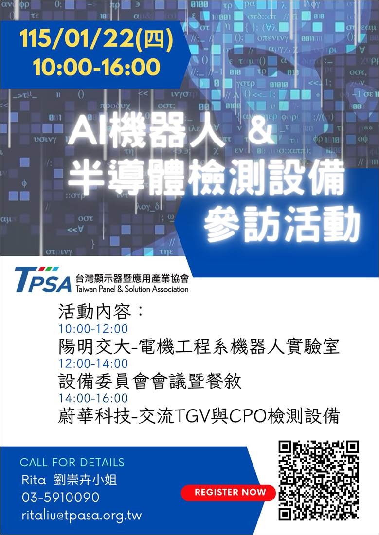 TPSA設備委員會謹訂於115年1月22日(四)辦理的「探索AI機器人與半導體先進檢測設備」參訪交流活動。活動特別安排參訪國立陽明交通大學電機工程學系機器人相關實驗室,以及業界領先的蔚華科技股份有限公司,實地交流TGV(玻璃穿孔)與CPO(矽光子共封裝)相關先進檢測設備。