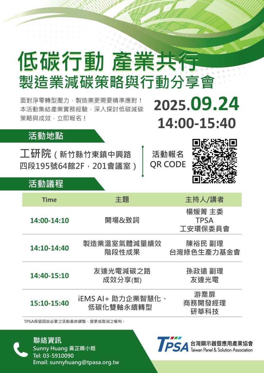 氣候變遷壓力加劇,製造業減碳已成營運與競爭力的關鍵。本次分享會聚焦企業如何落實減碳策略與管理行動,由台灣綠色生產力基金會揭示產業減碳績效成果,並邀請友達光電與研華科技分享第一線實務經驗,協助企業掌握趨勢、對應挑戰。歡迎產業先進共襄盛舉,一同推動低碳未來。